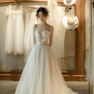 This dress boasts a romantic strapless design, a classic detail that adds a touch of allure and charm to your look. It frames your shoulders and collarbone beautifully, revealing just the right amount of skin.